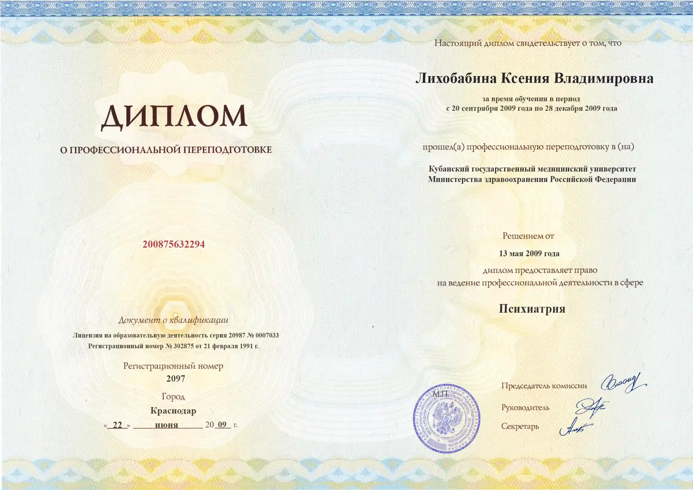 Получила образование в 2003 году по специальности «Лечебное дело» в Кубанском государственном медицинском университете. В 2009 году прошла переподготовку по психиатрии. В 2020 году получила сертификат специалиста по современным методам диагностики и лечения расстройств психики.